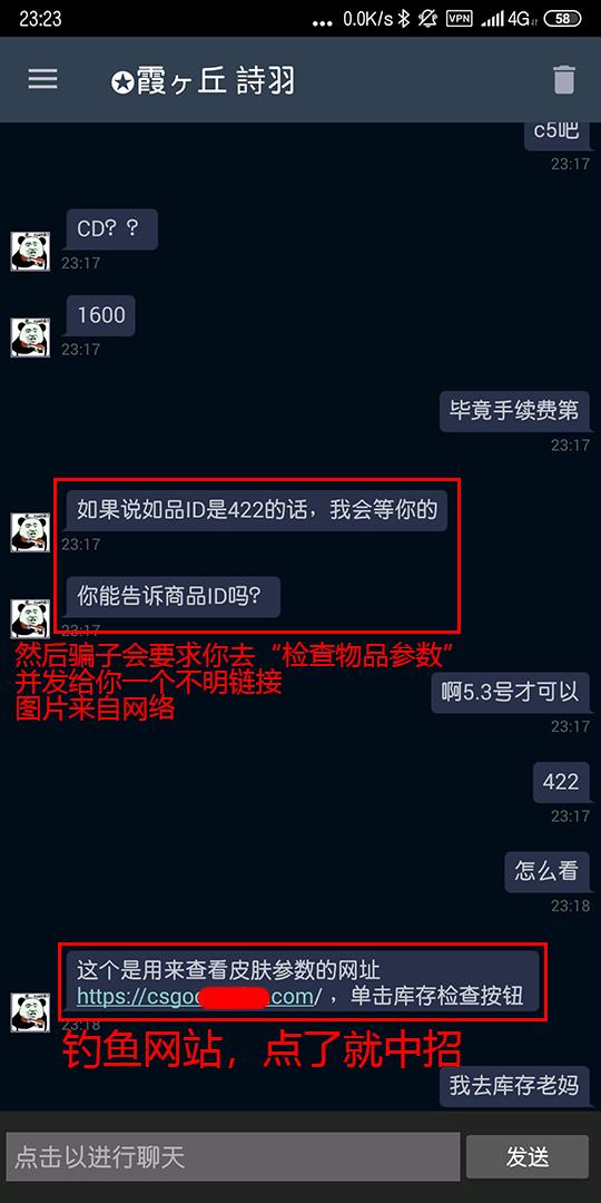 在个人主页留言板下留下信息,声称想要购买你的某一件饰品(理由很多,包括但不限于:你中奖了,快去XX领奖、跟你组队打游戏、新网站送你XX余额等等),附带不明链接