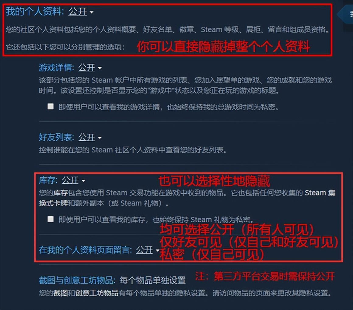 1、拒绝添加来路不明的Steam好友。若有必要,隐藏库存,关闭留言板有需求再打开,此方法能最大限度防止陌生人向你发送好友申请