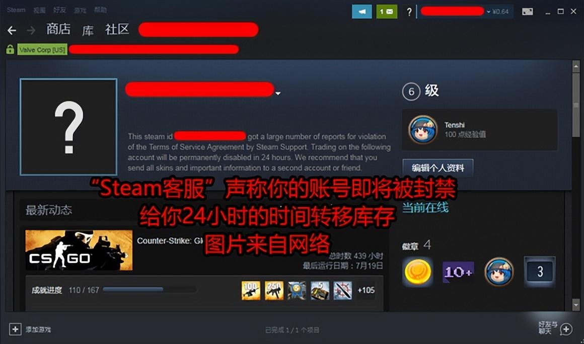 部分玩家会遇到以下情况:自己的头像变为VAC、好友被清空,“Steam客服”声称立即将被VAC封禁,但给你时间“转移有价值的库存”,急忙转移库存却发现饰品不翼而飞。此种骗术主动引诱你进行交易,而这时你的账号几乎就是被骗子控制,并在交易时下手