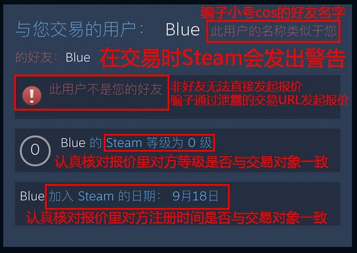 3、骗子可以模仿真正交易对象的昵称、头像甚至Steam等级,但有一点是几乎不可能模仿的:Steam注册时间(除非骗子为了钓你这条大鱼特意找了个注册时间相同的账号)。在第三方平台交易时平台会提醒你真正交易对象的注册时间,发起/接受报价时也能看到对方的注册时间,若两者不一致,这说明很有可能已经遭受API劫持,请立即中止交易。