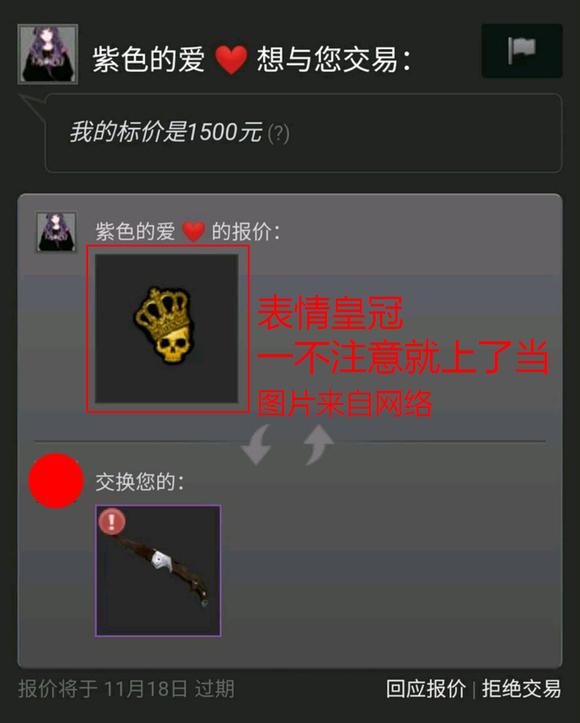 从19卡托开始,V社发行了Major通行证,拥有通行证的玩家可获取一些聊天表情,其中有一款就是皇冠贴纸模样的表情,骗子以此物品来向你发起报价,若不注意就被骗子用一个表情骗取了真正的CSGO饰品