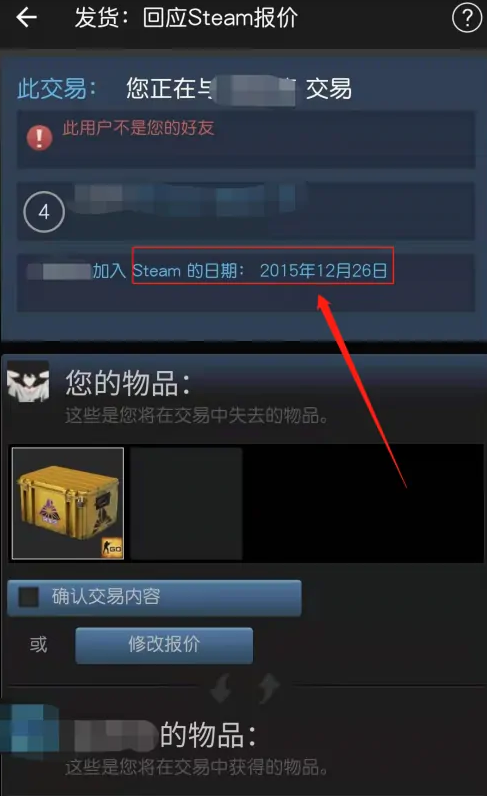 这里一定要注意:buff上显示的steam注册时间和你在确认的时候,对方steam注册时间必须一致。任何时候你一旦觉得不对,就去找客服问问。