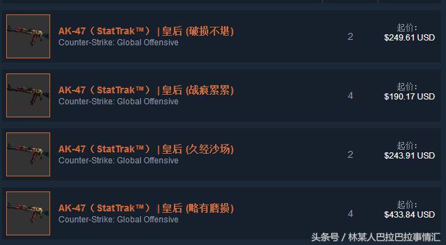 接着大家猜猜这把AK47皮肤——皇后的售价,相信很多人都想不到...在steam市场上最低的价格是190.17USD(美元)...最高售价是433.84美元...