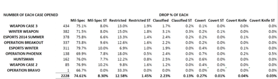 从设置上就可以看出来蓝色的皮肤占绝大多数,那么从概率学上来说开出稀有物品的概率到底是多少呢?很遗憾V社并没有公布具体数字,我们只能用最笨的穷举法来测试,当样本量越高就越能接近官方设定的数值。国外有一名玩家就是这么做的,该玩家一共开了9种类型共计2228个武器箱最终的结果如图: