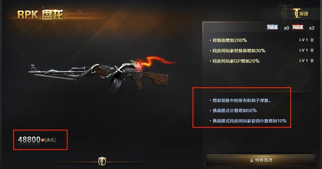 盘龙原价是48800CF点,也就是488QB。该枪是英雄级武器,拥有多个属性。而且枪身盘绕着一条闪耀的银龙,装备该武器的玩家可在挑战模式获得额外分数,是一把性能与外观并重的武器。