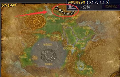 2、按照任务提示,需要获取4个荆棘根须。玩家前往荆刺高地,位置在地狱火半岛与泰罗卡森林交接位置,飞行才能到达。